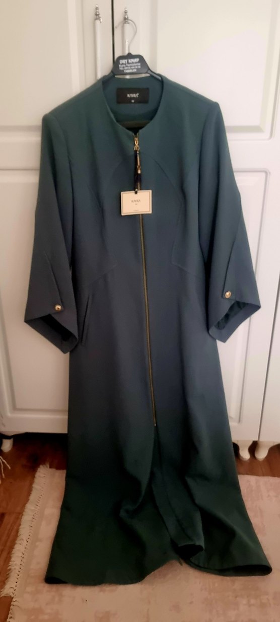 Uzun gri kadın ceketi, fermuarlı ve kesik yaka detaylıdır. Düğmeli uzun kollu, regular fit ve ipeksi kumaştandır. Ofis için klasik zarafet sunar.