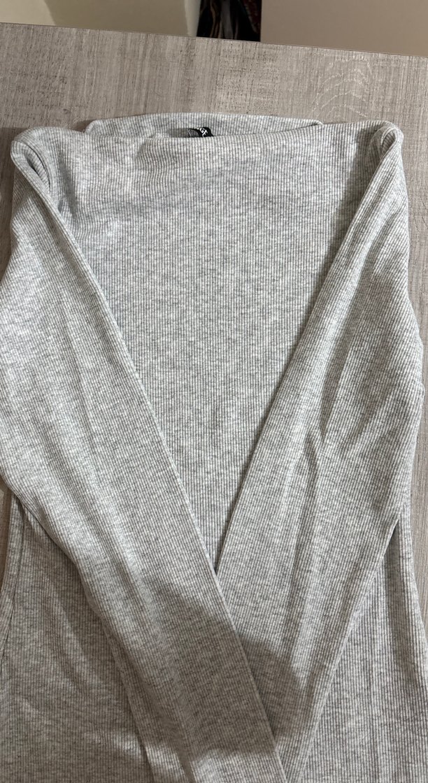 Gri renkte, keten kumaştan, uzun kollu ve tek renk, tekne yaka, dar kesim kadın bluz. Rahat ve şık, günlük kullanıma uygundur.
