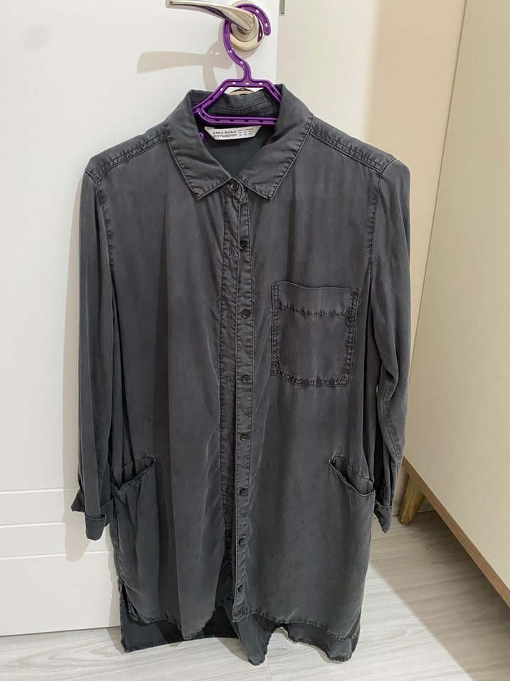 Gri renkte, keten kumaştan, düğmeli ve yaka detaylı uzun kollu bol kesim gömlek. Normal boyda, cepli ve günlük sokak stili için uygun.