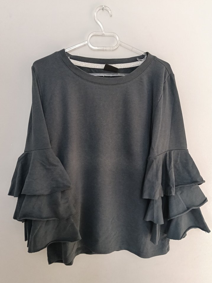 Gri renkte, yuvarlak yakalı ve bol kesim kadın bluz. Uzun kollarda kat kat fırfır detayı bulunur, yumuşak sentetik kumaştan üretilmiştir.