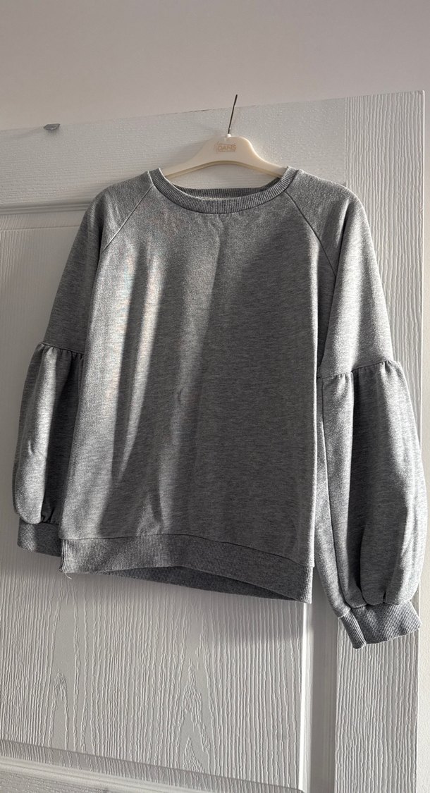 Gri renkli, uzun kollu ve fırfır detaylı kadın sweatshirtü. Rahat kesimi ve yumuşak keten kumaşıyla günlük sokak stili için uygundur.
