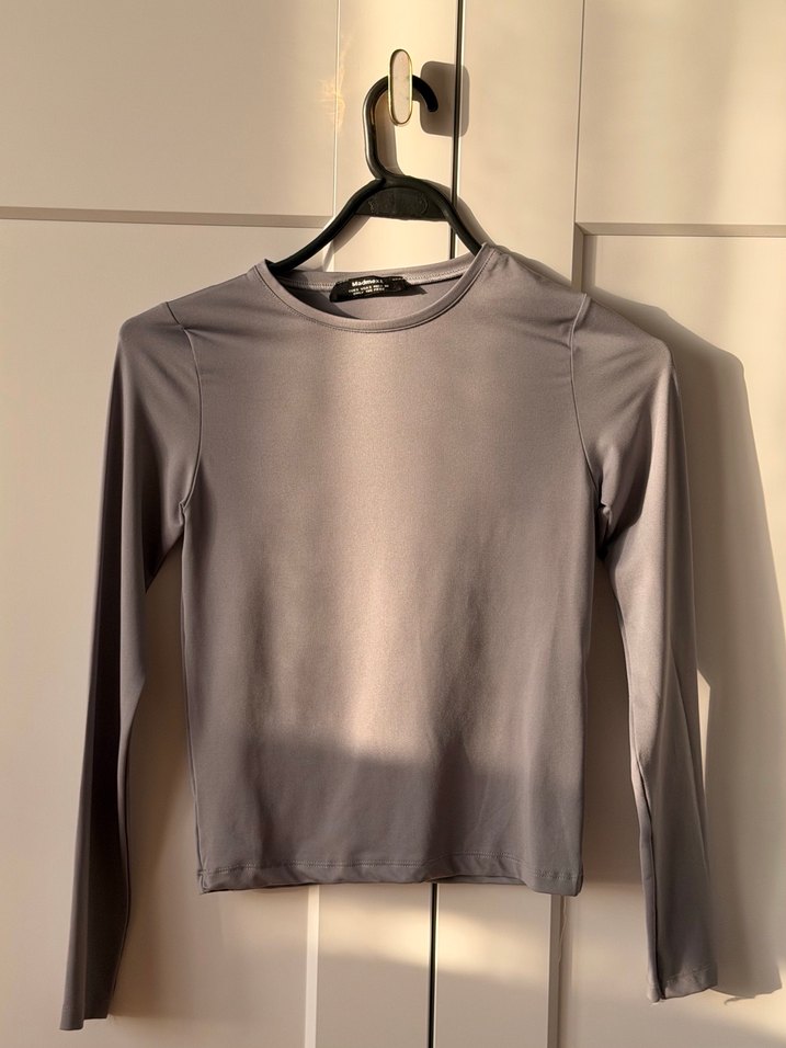 Gri renkte, uzun kollu ve yuvarlak yakalı, ince kesime sahip kadın tişörtü. İnce ve polyester, günlük kullanım için uygundur. Madmext.