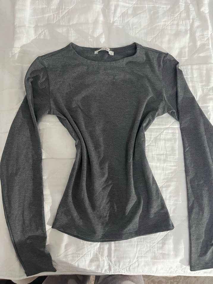Gri renkte, keten kumaştan yapılmış, uzun kollu ve yuvarlak yakalı, sade ve basic kesim kadın tişörtü. Günlük kullanıma uygundur. Hiç giyilmedi.