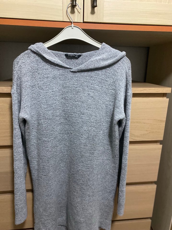 Gri yün örgü kazak, yuvarlak yaka ve uzun kollu tasarıma sahiptir. Normal uzunlukta ve bol kesimdir, günlük rahat kullanım için uygundur.