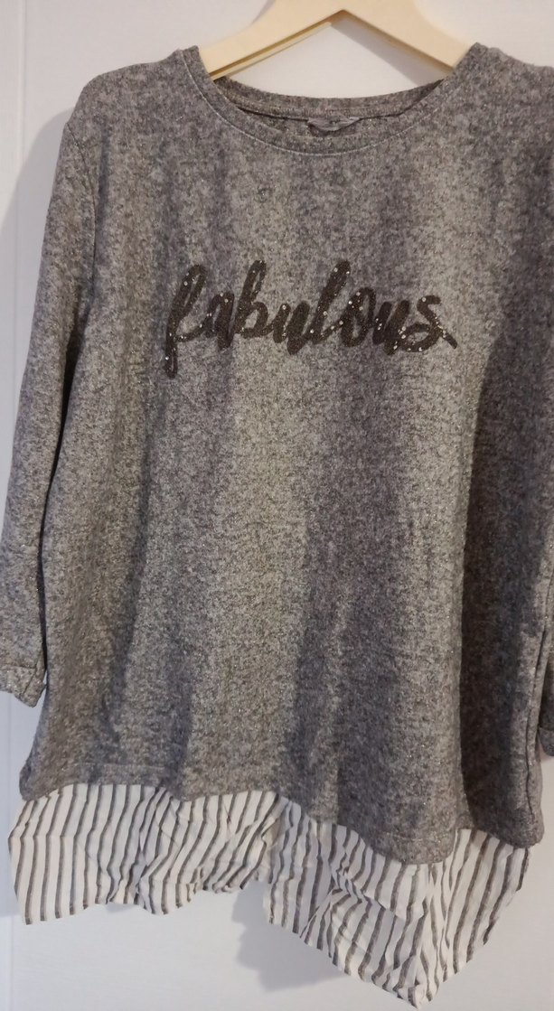 Gri renk, uzun kollu, yuvarlak yaka, örme yün kumaştan bol kesim kadın triko. Üzerinde 'fabulous' baskı deseni bulunur.