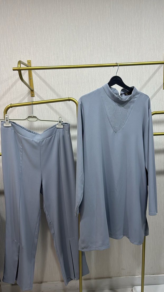 Gri Kadın Uzun Kollu paça ve yakasi taşlıYüksek Yaka Takım