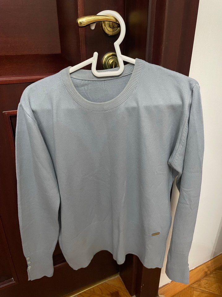 Gri renkli, uzun kollu, yuvarlak yakalı, pamuklu kumaştan yapılmış rahat kesim kadın kazak. Günlük rahatlık ve şıklık için uygundur.