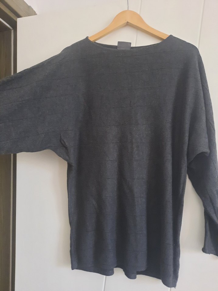 Gri renkte, uzun kollu ve salaş kesim kadın kazak. Yarasa kol ve midi boyda, günlük rahat kullanıma uygun şık bir parça.