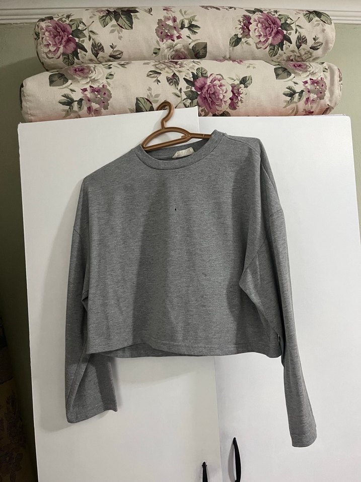 Gri renkli, uzun kollu, yuvarlak yakalı ve bol kesim kadın sweatshirtü. Pamuk kumaştan üretilmiş, sade ve günlük kullanıma uygun midi boyda rahat bir parça.