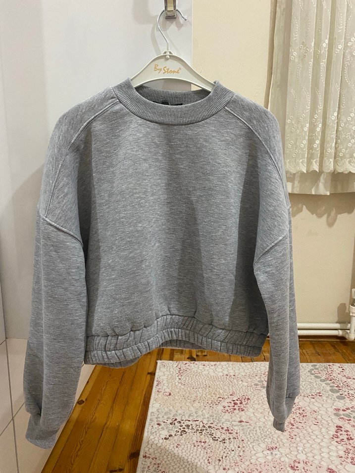 Gri renkli, yuvarlak yaka ve uzun kollu kadın sweatshirtü. Rahat kesimi ve yumuşak, sıcak kumaşıyla günlük kullanıma uygun, konforlu bir parça.