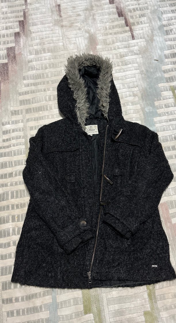 Bu gri renkli, yün kumaştan yapılmış, kapüşonunda kürk detaylı, uzun kollu ve uzun kesim kadın ceketi, sokak stiline uygun, günlük kullanıma uygundur.