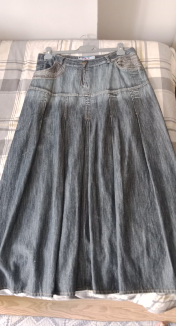Gri denim kumaştan, pileli ve bol kesim kadın uzun etek, günlük kullanıma uygun bohem tarzda.