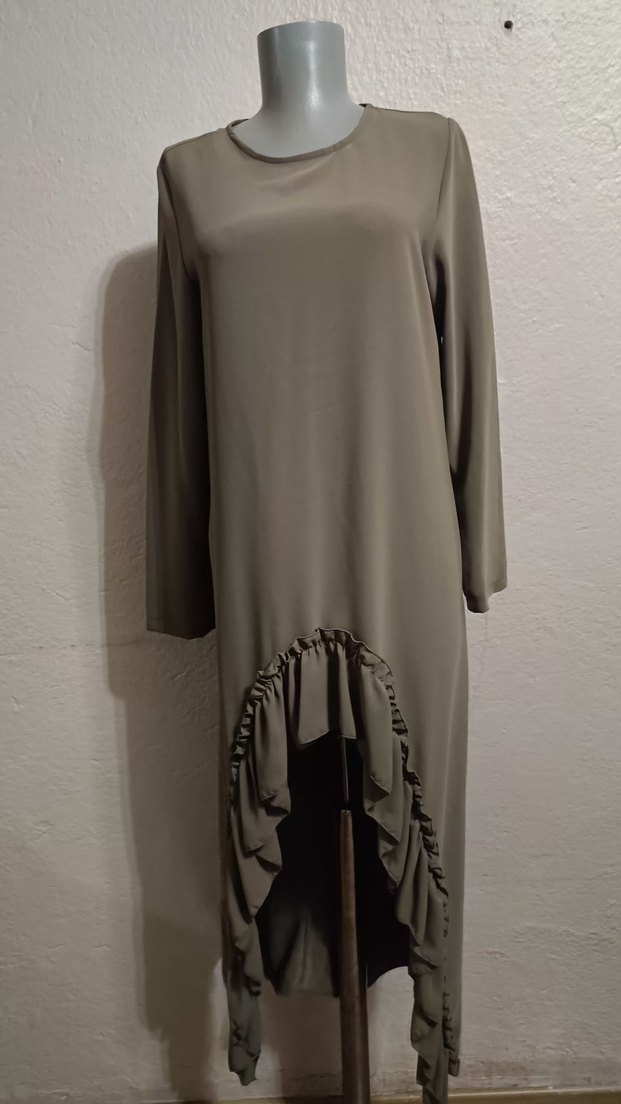 Uzun, salaş kesim kadın elbisesi, uzun kollu ve yuvarlak yaka detaylıdır. Yumuşak sentetik kumaştan üretilmiş olup, etek kısmında drapeli detay bulunur.