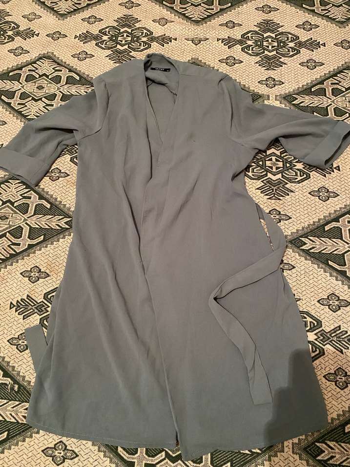 Salaş kesim, kısa kollu, kemerli uzun gri kadın kimono. Rahat ve günlük sokak stiline uygun kumaş.