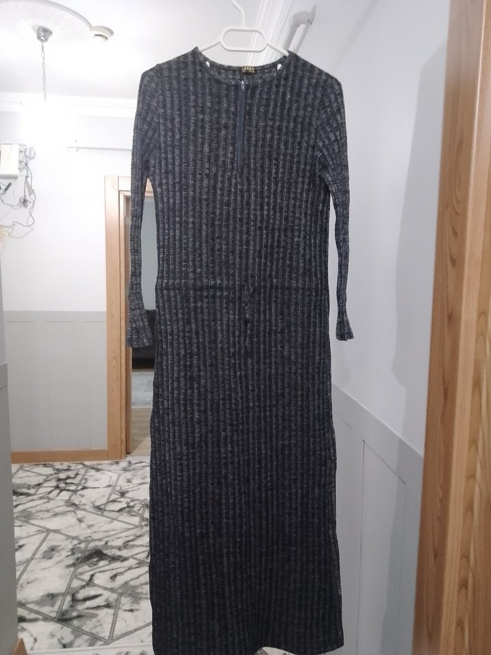 Gri renkte, uzun kollu ve yuvarlak yakalı, vücuda oturan triko kumaştan yapılmış kadın uzun elbise, rahat ve günlük kullanıma uygun ön yaka kısmı kapalıydı çocuk emzirdigim için mini bir fermuar detayi yaptırdım hiçbir sorunu yok kullanıma engel değildir.
