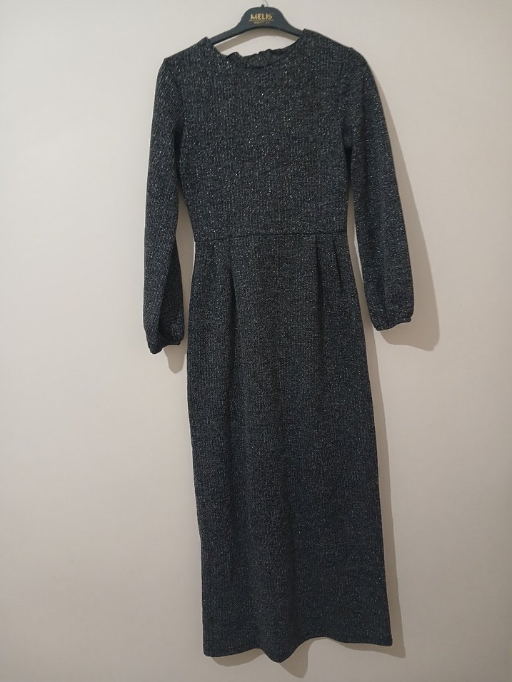 Gri renkte, uzun kollu, triko yün kumaştan yapılmış kadın uzun elbise. Regular fit kesimi ve modern klasik tarzı ile günlük kullanıma uygundur. Simli kalın kumaş abiye elbise 36 38 beden