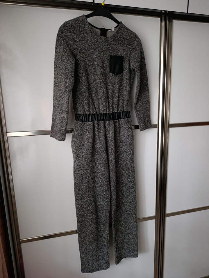 Gri renkte, uzun kollu ve yuvarlak yakalı kadın tulumu. Rahat kesimi ve kemer görünümlü tasarımıyla günlük kullanıma uygun