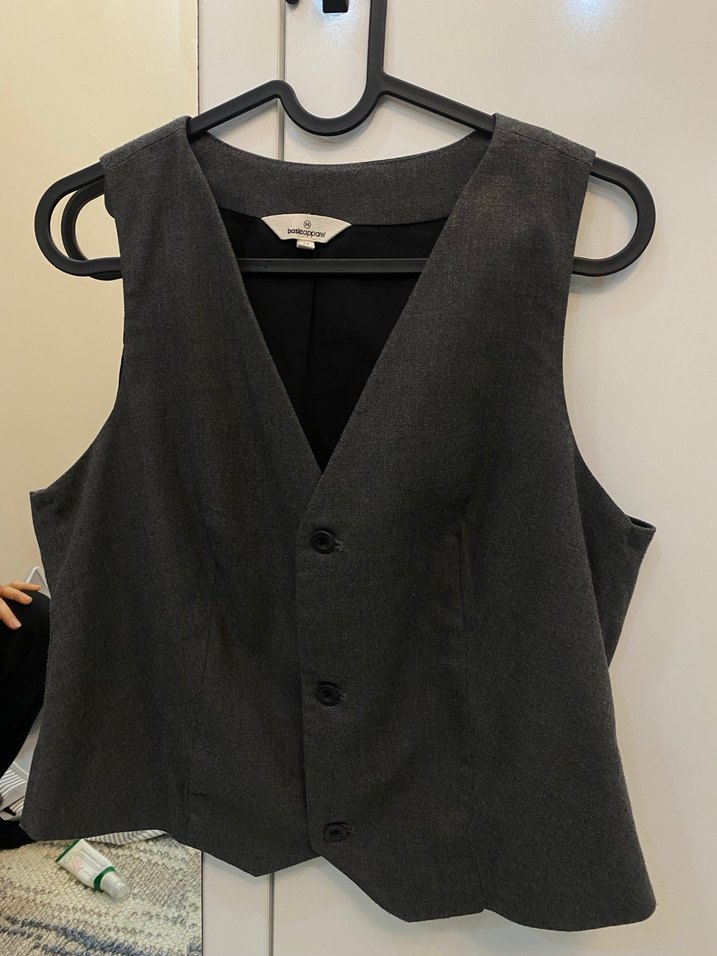 Gri kumaştan, düğmeli ve yaka detaylı, kolsuz kadın yeleği. Normal uzunlukta ve regular fit kesimiyle ofis şıklığı için uygun. 1 kez giyildi S-M uyumlu