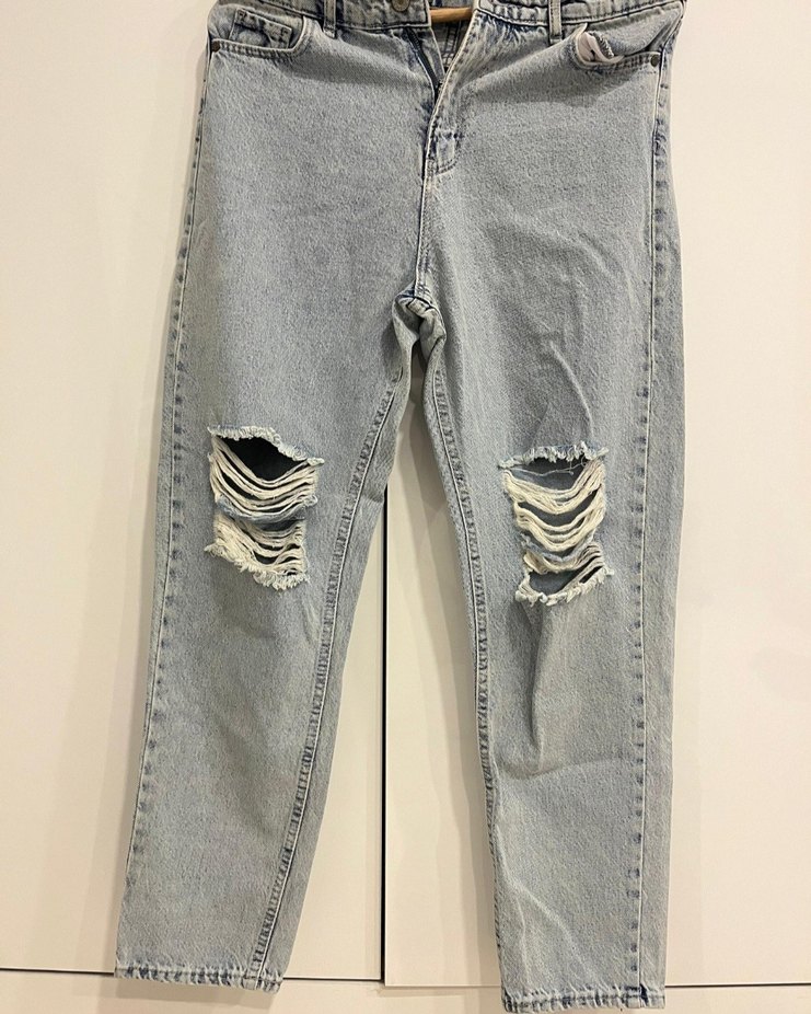 Ön kısmında yırtık detayları bulunan gri bol kesim kot pantolon, midi boyda ve günlük sokak stili için uygun.