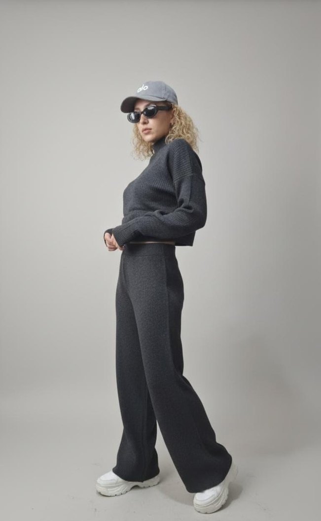 Gri renkli, yüksek yakalı ve uzun kollu kadın eşofman takımı, rahat kesimi ve yumuşak dokusuyla günlük kullanıma uygun şık bir görünüme sahiptir.