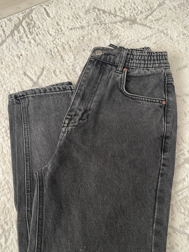 Gri denim kumaştan yapılmış, bol kesim ve yumuşak, normal boyda, lastikli bel yapısına sahip rahat kadın jean pantolon.Mom Jean.Beli lastikli olduğu için 34e de uygun