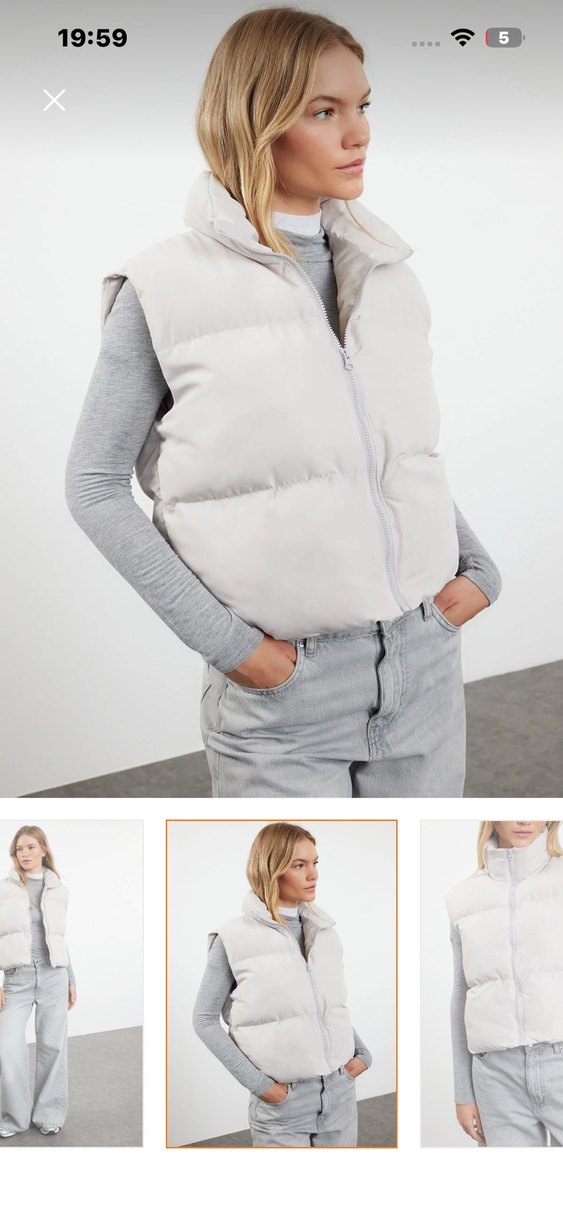 Yumuşak dokulu gri şişme yelek, yüksek yakalı ve kolsuz tasarıma sahiptir. Rahat kesimiyle günlük sokak stiline uygundur. Toz pembeye yakın bir rengi var