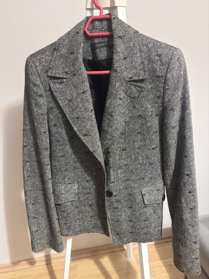 Gri yün kumaştan, düğmeli, uzun kollu, normal kesim midi uzunluğunda kadın blazer ceket. Ofis ve günlük kullanıma uygun.