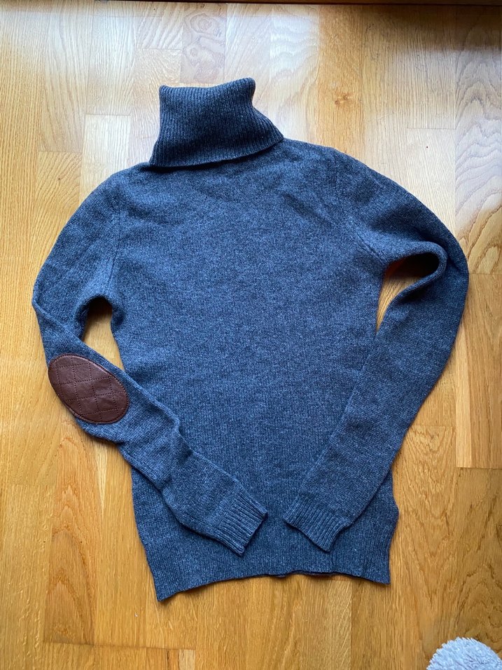 Massimo Dutti gri yün boğazlı kazak, %95 yün, %5 casmere dir. 61 boy, 42 en, 65 kol boyudur. El yıkanırken işk anda dışarıdan sabun sürüldüğü için koltuk altında hafif renk değişikliği vardır. uzun kollu ve örgü dokusuyla dikkat çeker. Normal boyda, dirsekde deri detaylı, rahat günlük iş stili için uygundur.