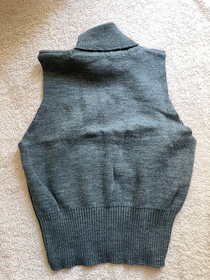 Boğazlı, kolsuz gri yün kazak. Vücuda oturan kesimi ve örgü dokusu ile sıcak tutar, rahat bir görünüm sunar.