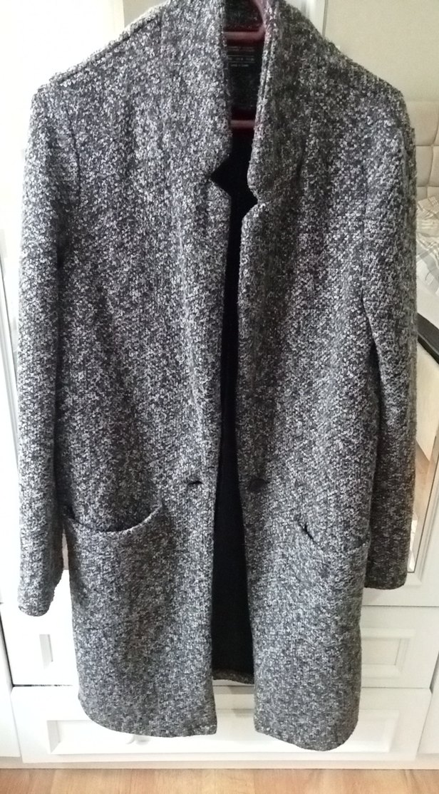 Gri yün kaban, düğmeli ve kesimli yakaya sahiptir. Uzun kollu, rahat kesim, günlük kullanıma uygundur ve normcore tarzındadır.