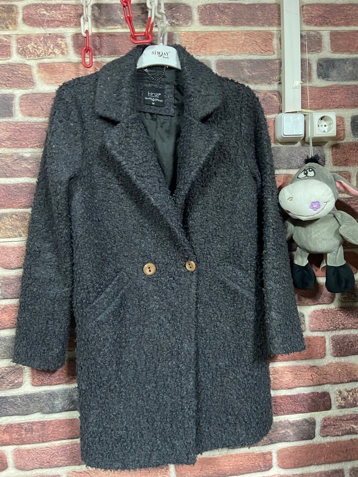 Gri renkte, yün kumaştan yapılmış kadın uzun palto. Düğmeli, kesik yakalı ve uzun kolludur, günlük kullanıma uygundur.