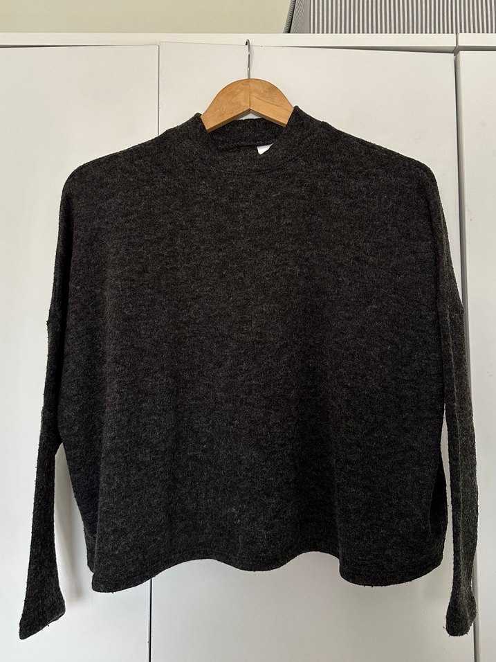 Gri renkte, yün örme kadın kazak. Bisiklet yaka ve uzun kollu, bol kesim ve normal boyda, rahat ve günlük kullanım için uygundur.