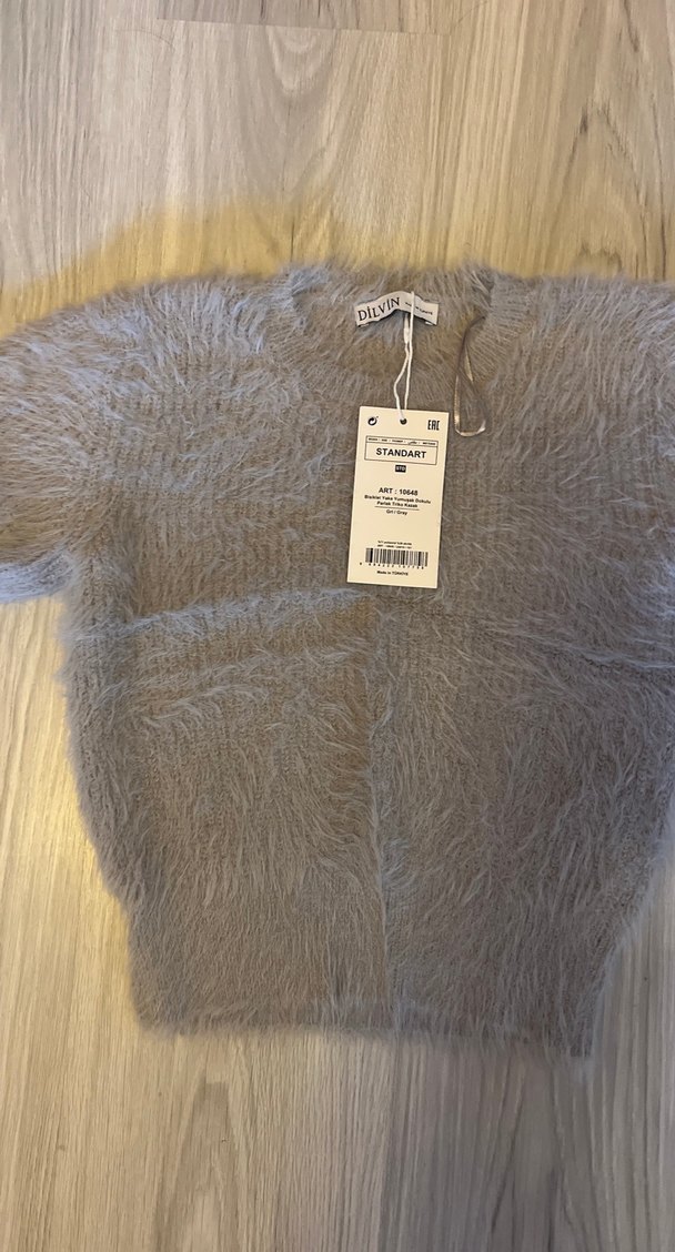 Gri renkte, yumuşak yün kumaş ve kürklü detaylara sahip kadın kazak. Yuvarlak yaka, uzun kollu ve rahat kesimlidir. Baskılı deseniyle şık bir görünüm sunar.