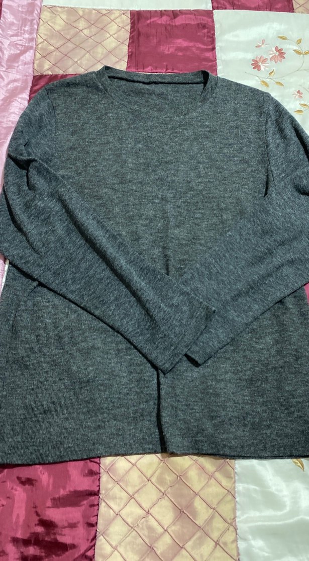 Gri renkte, yuvarlak yakalı ve uzun kollu kadın yünü kazak. Rahat kesim ve normal boyda, günlük kullanım için uygundur.
