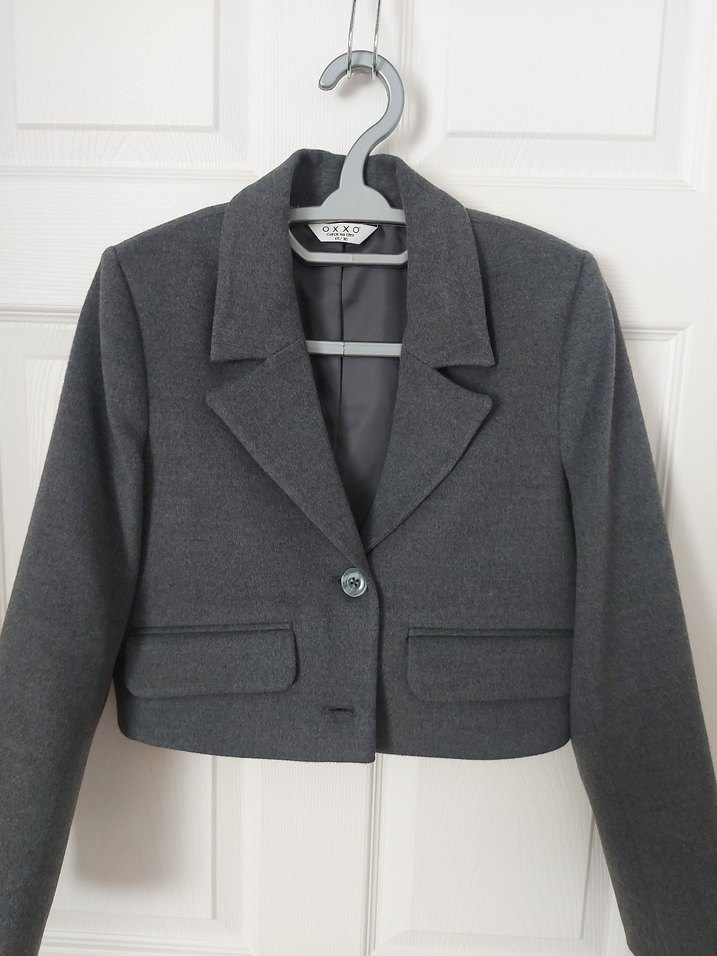 Gri renkte, yün kumaştan yapılmış, düğmeli, normal kesim ve crop kadın blazer. 34 bedene de olur.