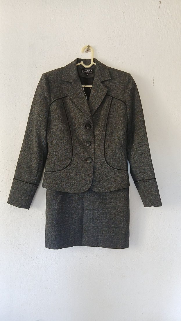 Gri renkli, yün kumaştan yapılmış kadın takım. Düğmeli, klasik yakalı ve midi etek boyuna sahiptir. Uzun kolludur, ofis için uygundur.