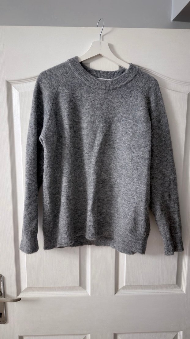 Bir kere giyildi yeni gibi! L-Xl oversize Kadınlar için gri, yuvarlak yakalı, uzun kollu yün örgü kazak. Normal boyda, bol kesim ve basic tarzda, günlük kullanıma uygun rahat bir parça.