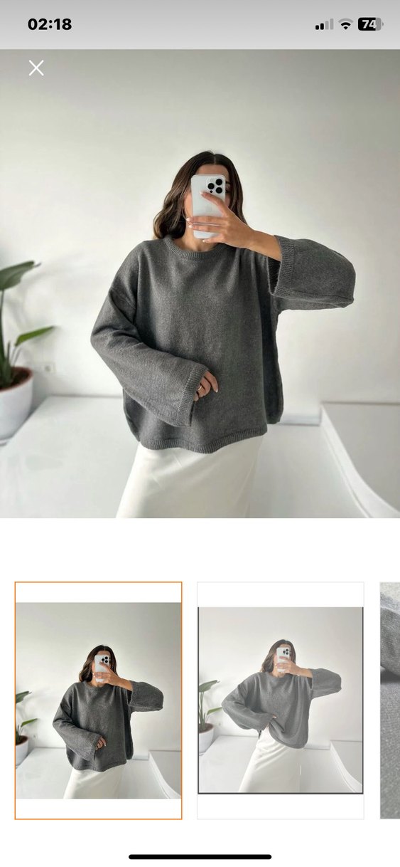 Gri renkli yün kumaştan, salaş kesim, uzun kollu ve yuvarlak yakalı kadına özel kazak. Rahat ve şık bir günlük kullanım ürünü. M beden ama geniş kalıp L a da uygun