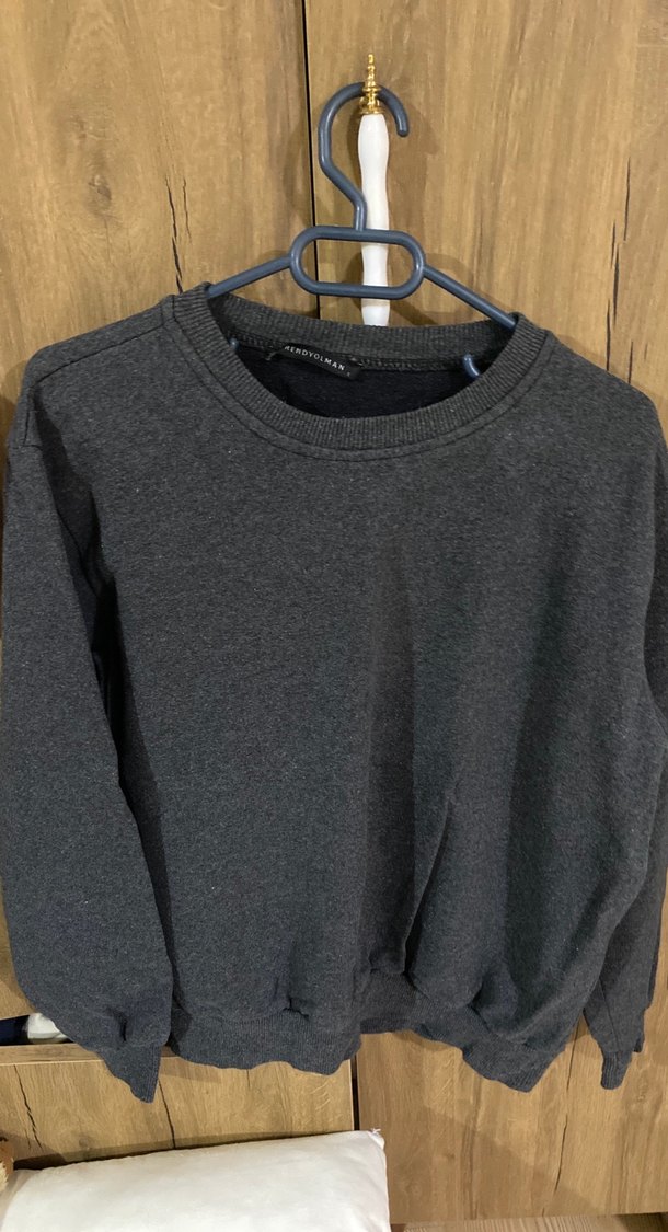 Gri yün sweatshirt, bisiklet yaka ve uzun kollu. Salaş kesim ve normal boyda, gündelik kullanıma uygun sade ve desensiz tasarım.