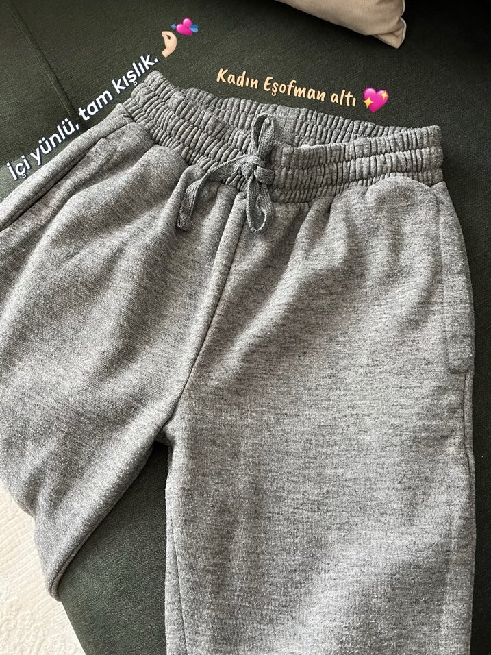 Gri pamuklu, yünlü astarlı, bol kesim ve midi boy kadın eşofman altı. Günlük kullanıma uygun, rahat ve şık.