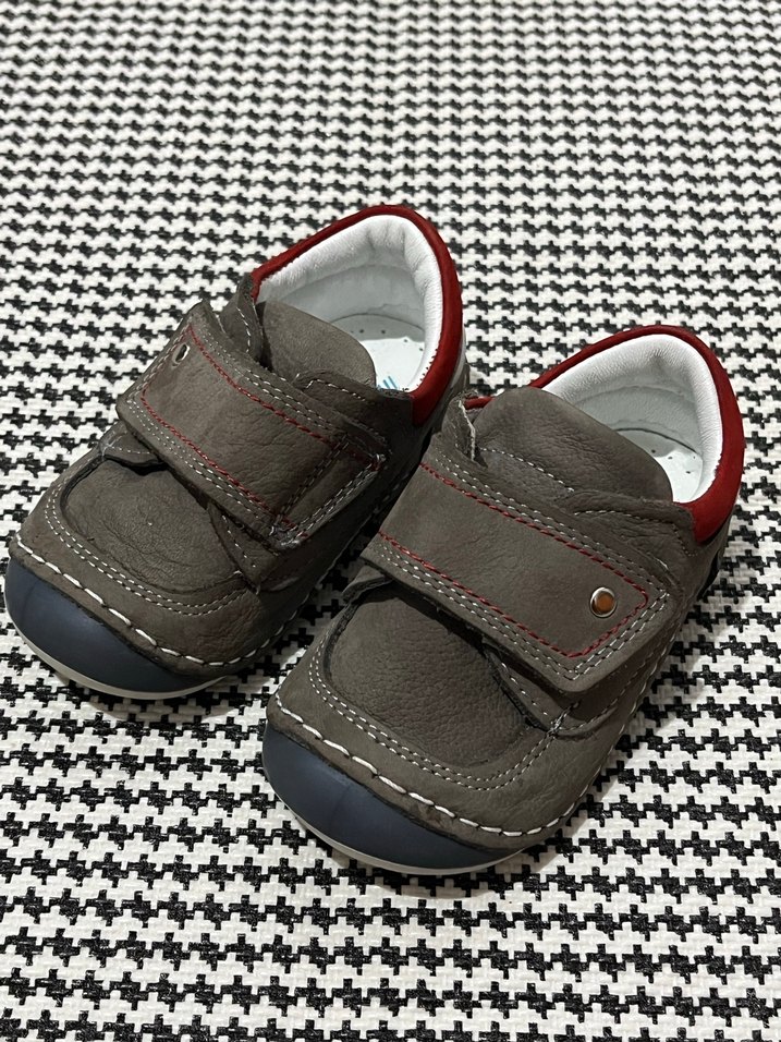 Gri ve kahverengi tonlarında, cırtlı bantlı, kauçuk tabanlı erkek bebek ilk adım ayakkabısı. Günlük ve modern tarzda, rahat kullanımlı.