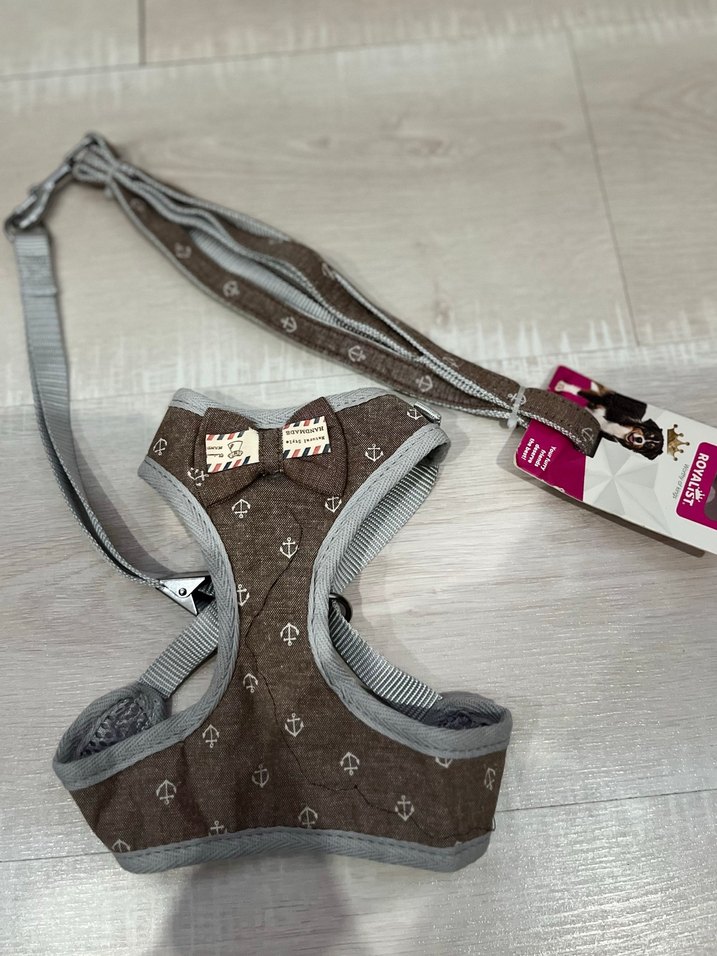 Gri ve kahverengi renklerde, desenli köpek göğüs tasması ve uyumlu tasma ile rahat kontrol sağlar.
