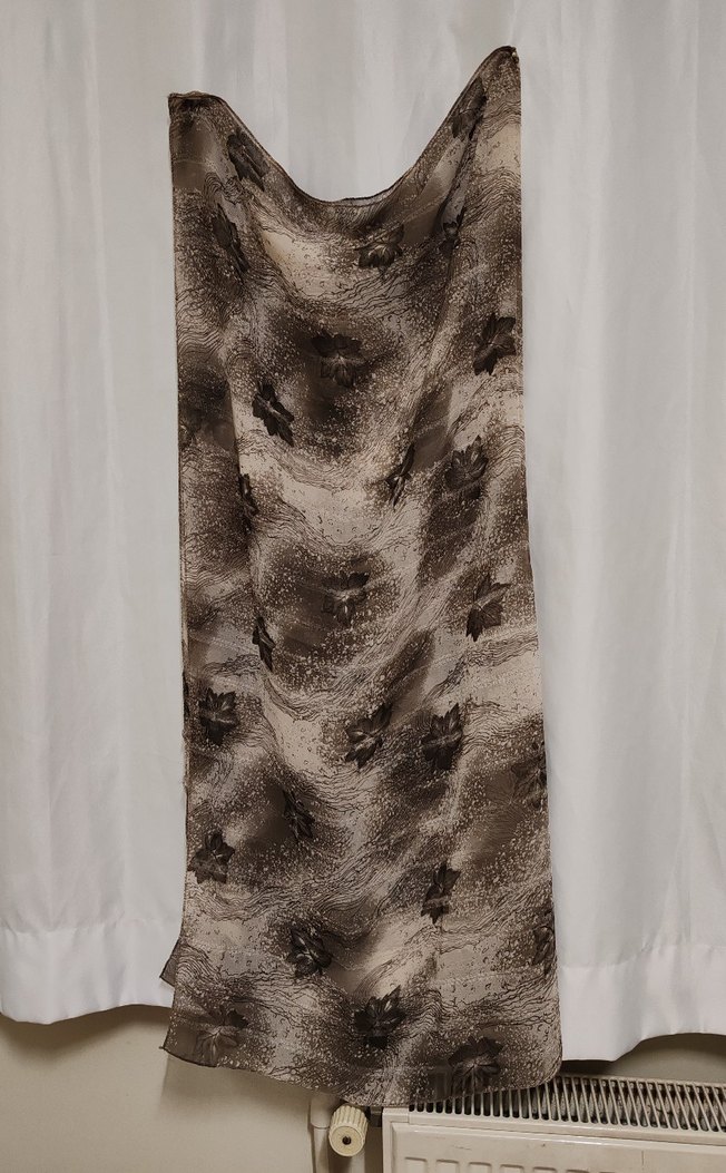 Gri ve kahverengi tonlarda, dökümlü tasarıma sahip kadın şalı. Yumuşak sentetik kumaştan, modern ve şık bir görünüm sunar. 100'e 100 cm. kare başörtüsü. Üzerinde marka yazmıyor, az kullanılmış, hiçbir sorunu yok. Yeni sahibini güle güle kullansın