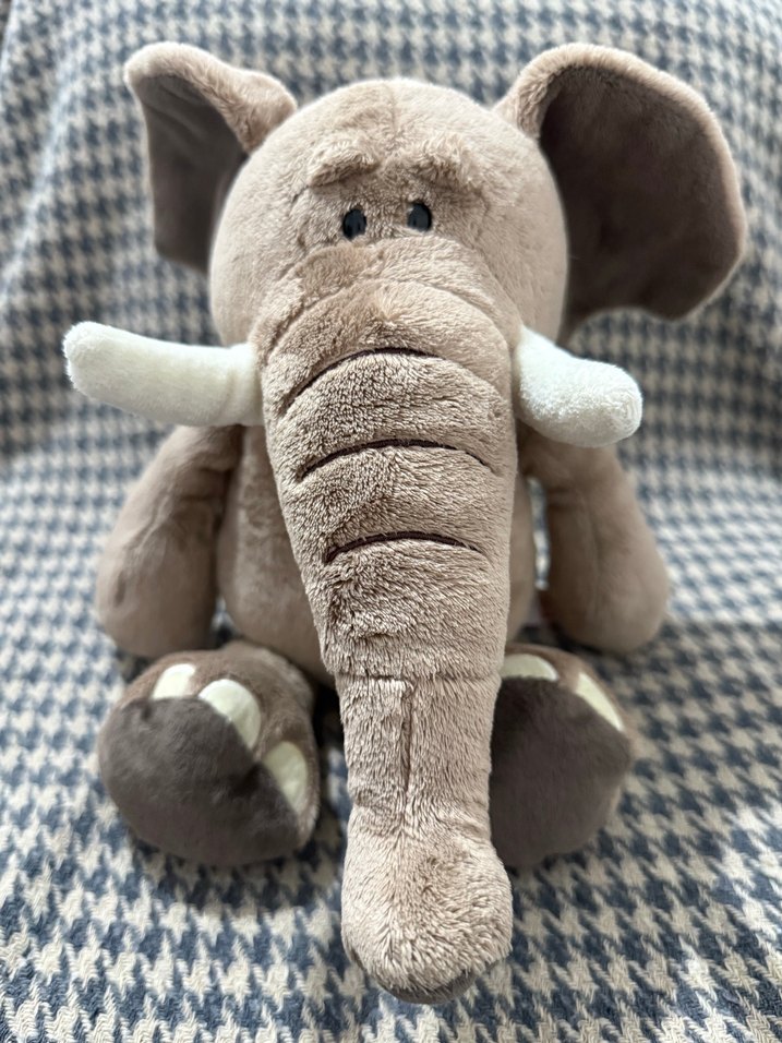 Büyük kulakları ve dişleri olan, gri ve kahverengi renklerde yumuşak peluş fil oyuncak. Rahatlık ve oyun için uygun. Ürün boyutu 30 cm’dir