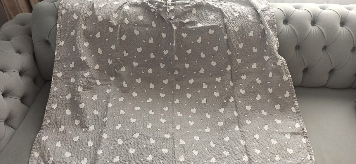 Gri renkte, kalp desenli yumuşak dokulu emzirme önlüğü hiç kullanılmadı