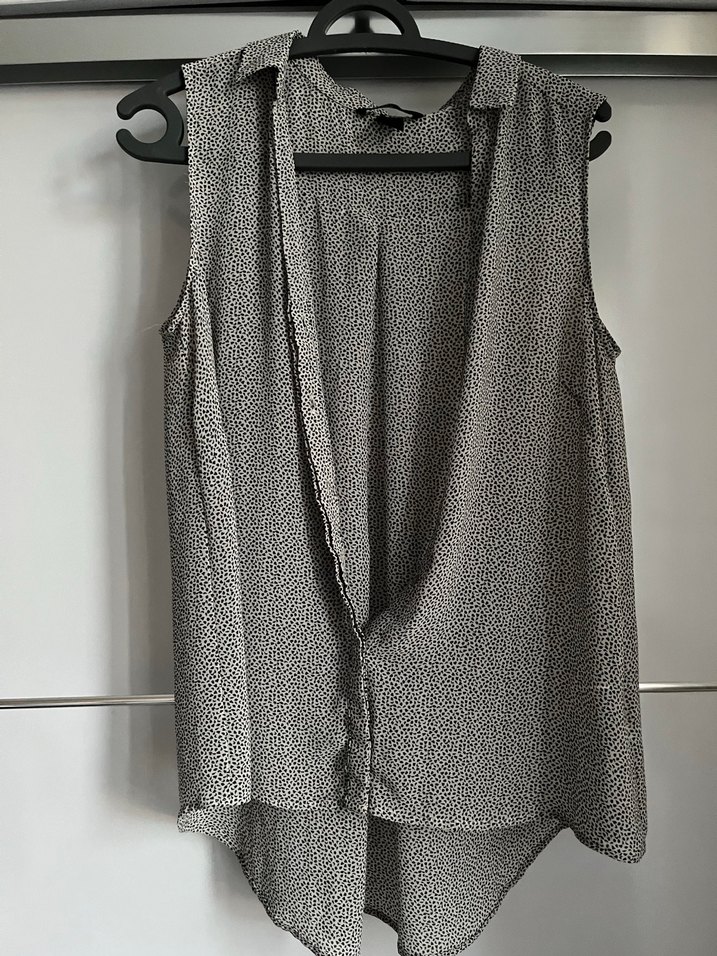 V yakalı, kolsuz ve salaş kesimli kadın bluz. Gri kalp desenli, midi boyda ve dökümlü tasarıma sahip. Günlük rahat sokak stili için uygun.