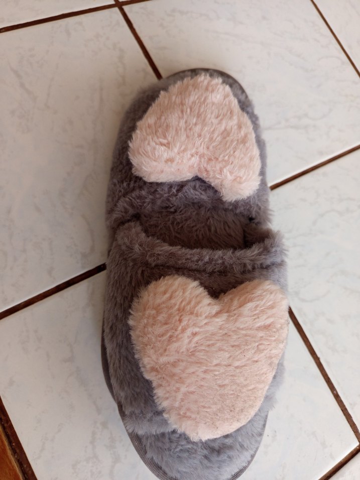Gri peluş kumaştan, kalp işlemeli yumuşak tüylü detaylara sahip, dolgu topuklu kadın ev terliği. 39 no sıfır ürün kalıbı küçükmüş 37-36 daha rahat olur