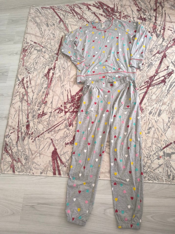 Renkli kalp desenli gri, bol kesim kadın pijama takımı. Kısa kollu üst ve uzun pantolon, yumuşak kumaştan rahatlık sağlar.