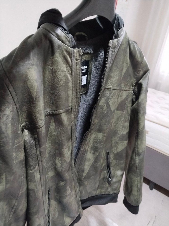 Gri kamuflaj desenli, fermuarlı, uzun kollu, kesimli deri erkek ceket. Sokak stiline uygun, normal uzunlukta ve notched yaka detaylı.