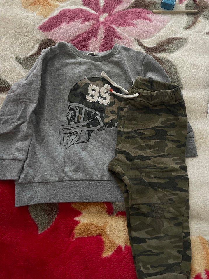 Gri uzun kollu üst, kamuflaj kask baskısı ve 95 numarası ile, kamuflaj desenli pantolonla birlikte. Yumuşak ve sıcak kumaştan, bisiklet yaka ve örgü detaylı.
